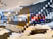 Spanning 32.5 sqm, the condo is fully furnished with contemporary pieces. The living room features a marble accent wall, wooden flooring, and a comfortable brown cushioned sofa, perfect for relaxing with friends. The modern kitchen is equipped with built-in cabinets, an electric cooktop, and a compact oven for effortless meal preparation.