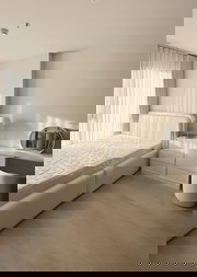 The units bright and airy interior features large windows, offering expansive views of Bangkoks skyline and allowing for ample natural light. The living room is tastefully adorned with modern furnishings, including a beige two-seater sofa, a glass top dining table, and an entertainment console that complements the spaces contemporary vibe. The bedroom continues the sophisticated aesthetic with a minimalist design equipped with a double bed, wooden flooring, and a mirrored wardrobe.