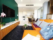 The sleek kitchen is equipped with state-of-the-art appliances, including an electric cooktop, built-in microwave, and a stainless steel sink. Enjoy ample cabinetry and a neutral color palette that blends functionality with aesthetic appeal. The luxurious bathroom features a glass shower enclosure, modern tile design, and a spacious wall-mounted mirror.