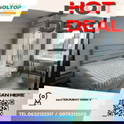 Spanning 44.43 sqm, this condo exudes a stylish, modern aesthetic with its open-plan living area, sleek wooden flooring, and abundant natural light streaming through large windows. The living room features a large wall-mounted TV and a comfortable seating area, perfect for leisurely evenings. A built-in shelving unit with decorative items adds a touch of elegance, while pendant and recessed lighting enhance the ambiance.