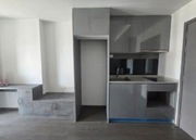 - Kitchen fitted with a refrigerator and built-in cabinets.