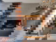 Step into expansive living spaces adorned with floor-to-ceiling windows that bathe the home in natural light. The living area showcases modern elegance with contemporary decor, a comfortable gray sofa, wooden accent elements, and a flat-screen TV. Embrace the open-plan design with light wood flooring and a harmonious neutral color palette.