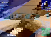 Each bedroom is fitted with double beds, large windows offering stunning city views, and polished hardwood floors. The master suite offers an en-suite bathroom with a sophisticated glass partition, providing privacy and elegance.