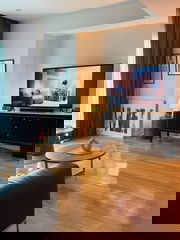The condo boasts a thoughtfully curated interior, fully furnished with elegant pieces. Step into a bright living room featuring large windows that flood the space with natural light, complemented by hardwood floors and a minimalist dÃĐcor that enhances the open and airy ambiance. The stunning city views serve as a perfect backdrop to the large leather sofa and contemporary furnishings.