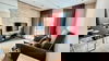 - Spacious Living Area: The open-plan living room features hardwood flooring, a wall-mounted flat-screen TV, and large windows that flood the space with ample natural light, offering an impressive city view.
