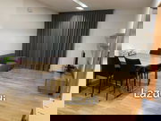 The fully furnished 70 sqm unit boasts two bedrooms and two bathrooms, each space thoughtfully designed with modern aesthetics and functionality in mind. The living room, characterized by hardwood flooring, modern wooden furniture, and a warm color scheme, is bathed in natural light thanks to the sliding glass doors that provide access to a serene balcony.