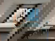 Step into the spacious living and dining area featuring an open-plan layout with neutral color tones enhanced by decorative lighting and a mirrored wall that reflects light brilliantly. Relax on the comfortable sofa while admiring the elegant wall art and large balcony window that floods the space with natural light. Dine in style at the glass table, complete with upholstered chairs and elegant table setting. Adjacent to the dining area, the sleek kitchen boasts modern appliances including a refrigerator, microwave, and stovetop, all highlighted by ample counter space.