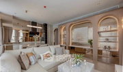 The expansive 182sqm unit boasts an open layout with a luxurious sectional sofa and complementary furnishings. Floor-to-ceiling windows flood the living space with natural light, offering captivating city views and an inviting atmosphere enhanced by recessed lighting and a neutral color palette.