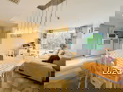 The open floor plan features a sizeable living area bathed in natural light, adorned with a neutral color scheme, modern furniture, and tiled flooring that extends seamlessly to an integrated kitchen and dining area. The contemporary design principles are evident throughout, ensuring a living space that feels both elegant and welcoming.
