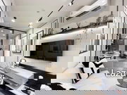 The condo features a light-filled open-plan layout boasting wooden flooring paired with minimalist modern decor. In the living area, enjoy a wall-mounted TV and built-in shelving, perfect for entertainment and storage. The natural light from the large sliding glass doors fosters a welcoming atmosphere, complementing the modern cabinetry and compact kitchenette, equipped with essential amenities.