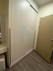 Spanning 28 sqm, the condo presents a fully furnished living space, perfectly suited for single occupants or couples. The first-floor location offers convenience, while wooden flooring enhances the cozy ambiance of the living room, which features a wall-mounted TV, sofa, and a dining table framed by elegant golden curtains. Air conditioning ensures a comfortable climate year-round.