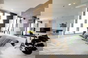 The condo boasts an interior size of 39 sqm, featuring elegant wooden flooring and contemporary furnishings. The spacious living area is adorned with a comfortable grey sofa, a stylish dining table, and recessed lighting, providing a cozy yet modern ambiance. Floor-to-ceiling windows flood the space with natural light, enhancing the serenity of your city skyline view.