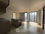 The 50 sqm interior skillfully blends style with functionality. The open-plan living area, adorned with elegant wooden flooring, is bathed in natural light from the large windows, providing stunning views of the Bangkok skyline. A comfortable sofa, modern decor, and a wall-mounted TV complete this inviting space.