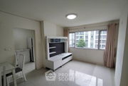 The condo is situated on the 4th floor of an 8-story building, comprising only 69 units, which ensures an intimate community atmosphere. The living room features a large window that floods the space with natural light, complemented by a modern entertainment unit and elegant tile flooring.