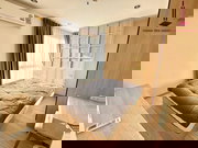 Spanning 30.41 sqm, this unit is impeccably designed with a minimalist aesthetic. The living room boasts a light-colored sofa complemented by large windows with curtains, allowing an abundance of natural light to illuminate the space. The wooden flooring adds warmth, while the open-concept layout offers seamless access to the kitchen, equipped with built-in cabinets, a refrigerator, and an electric stove.
