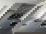 - Kitchen fitted with a refrigerator and built-in cabinets.