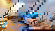 The open-plan living area includes a stylish modern kitchen complete with wooden cabinets, an induction cooktop, and a contemporary dining table set. Built-in cabinets and overhead lighting ensure functionality.
