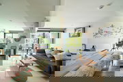 The open-plan layout seamlessly integrates the stylish kitchen area, equipped with light wood cabinets, an induction cooktop, and modern stainless steel fixtures, set against a beige backsplash. White tiled flooring and a stone accent wall complete the ambiance.