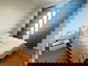 - Bedroom: Experience comfort in the spacious bedroom, furnished with a plush headboard, decorative pillows, and light-colored curtains framing an impressive city skyline view.