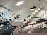 Designed with a modern aesthetic, the condo boasts a neutral color palette enhancing its spacious feel. The living area is highlighted by a comfortable sofa, contemporary wall art, and minimalist lighting, making it an inviting space to relax. Wooden flooring and decorative plants add a touch of warmth and style.