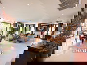The living area is generously proportioned, featuring a large sectional sofa, modern ceiling fans, and decorative lighting that accentuates the wooden flooring. The dining area is stylishly set with a glass dining table and contemporary chairs, perfect for intimate dinners.