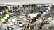 The dining room boasts a chic glass dining table with upholstered chairs, stunning pendant lights, and decor that seamlessly connects to the adjacent seating area with marble flooring. The contemporary kitchen is equipped with high-gloss white cabinets, stainless steel appliances, and spacious countertops, ensuring a delightful culinary experience.