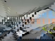 Situated on the 3rd floor, this 51.24 sqm condo features a spacious balcony, complete with wooden flooring and privacy shutters, ideal for relaxing in the tropical climate. The fully furnished interior boasts modern aesthetics, with a bright living room adorned with natural lighting, a comfortable two-seater sofa, and chic wooden flooring.
