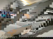 The fully furnished condo is designed with a refined modern aesthetic. The kitchen comes equipped with modern cabinetry, a grey color scheme, integrated appliances, and a compact, efficient layout complete with ample storage and electric outlets.