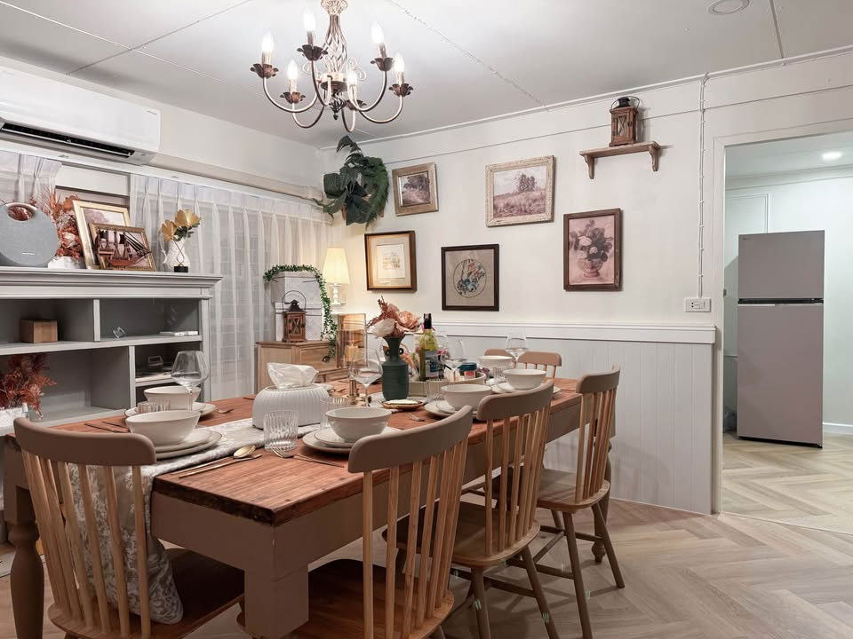 ห้องอาหาร: โต๊ะขนาดใหญ่ + ชุดจานชามครบครัน