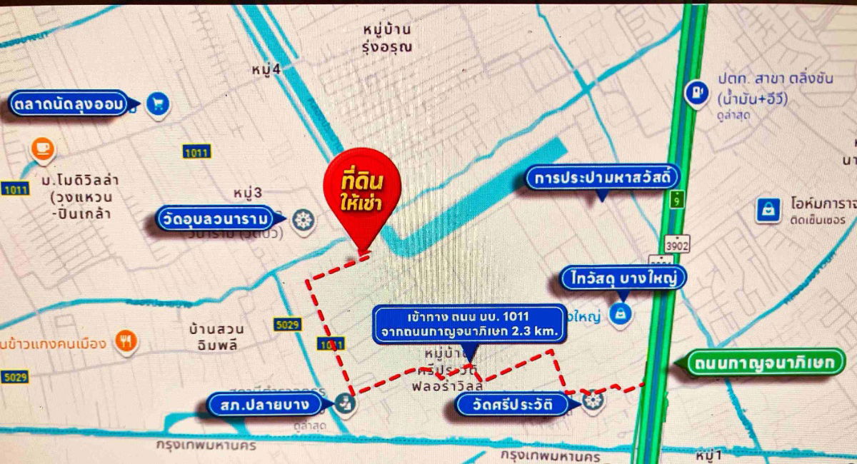 ให้เช่าที่ดิน 160 ตารางวา อยู่ห่างจากด้านหลังไทวัสดุ บางใหญ่แค่ 1.8 km และห่างจากถนนกาญจนาภิเษกแค่ 2.3 km โดยรอบตัวที่ดินทั้ง 3 ด้านติดถนนทางหลวงชนบท นบ.1011 (ซอยสำเร็จพัฒนา) ทำให้ผู้สัญจรสามารถมองเห็นที่ดินได้อย่างชีดเจน และอยู่ท่ามกลางชุมชนขนาดใหญ่ ใกล้กับวัดศรีประวัติ วัดอุบลวนาราม (วัดบัว บางกรวย) การประปามหาสวัสดิ์ สถานีตำรวจภูธรปลายบาง มีหมู่บ้านจัดสรรมากมาย มีรถผ่านหน้าที่ดินตลอดทั้งวัน เนื่องจากเป็นหนึ่งในเส้นทางหลักที่ลัดผ่านจากถนนกาญจนาภิเษก ไปศาลายา และพื้นที่อื่นในบางใหญ่