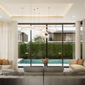 ภายในอบอุ่น เรียบสงบ ด้วยโทนวัสดุธรรมชาติ ห้องนั่งเล่นที่เปิดมุมมองถึงสระว่ายน้ำส่วนตัว